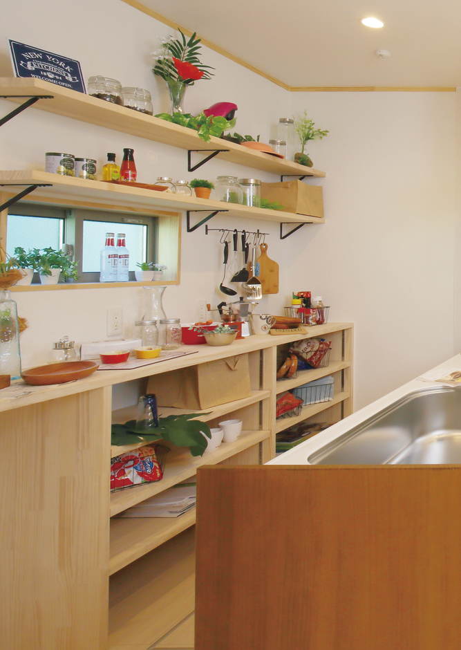 キッチンの背面にはシンプル ナチュラルな収納を造作した イエタテ